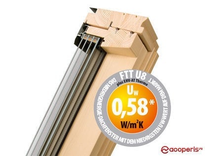 Fereastra supertermoizolatoare cu deschidere mediana FTT U8 Thermo special destinata caselor eficiente energetic dar si caselor pasive. Sticla este amplasata intr-o cercevea special construita, cu profile din lemn mai late comparativ cu ferestrele obisnuite. Aceasta constructie minimizeaza fenomenul puntilor termice si confera o izolatie mai buna ferestrei. Fereastra FTT U8 Thermo cu un coeficient de transmitanta termica Uw=0.58W/m2K este cea mai « calduroasa » fereastra de mansarda de pe piata.Deschiderea supramediana asigura confortul utilizarii.